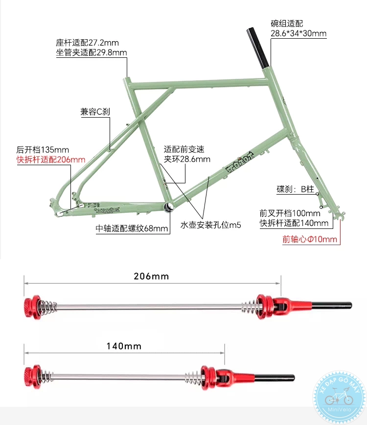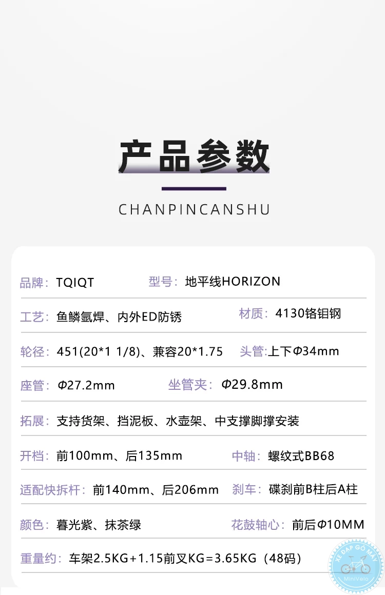 Sườn TQIQT Horizon là lựa chọn lý tưởng cho build minivelo đa năng, touring hoặc urban. Khung thép Cr-Mo bền bỉ, , tương thích bánh 20 inch (406) thắng dĩa hay 451 cả thằng dĩa và thắng C, tối ưu cho nhiều cấu hình từ đi phố đến off-road nhẹ.